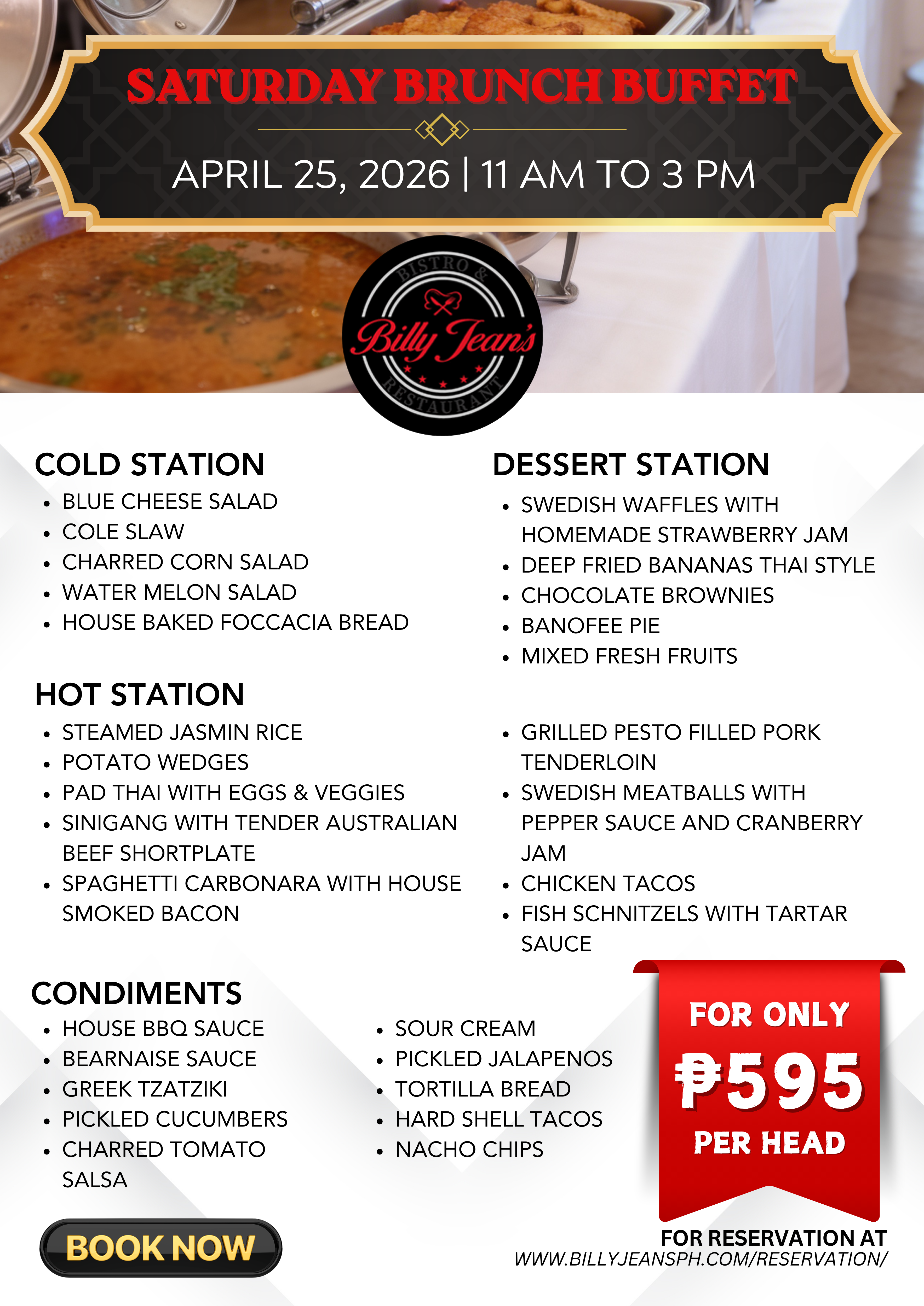 Make your weekend extraordinary at the Saturday Brunch Buffet of BillyJean’s Bistro & Restaurant, happening on April 25 from 11:00 AM to 3:00 PM. Indulge in a rich and satisfying spread where European comfort classics meet vibrant Asian flavors—perfect for a relaxing and flavorful weekend escape.